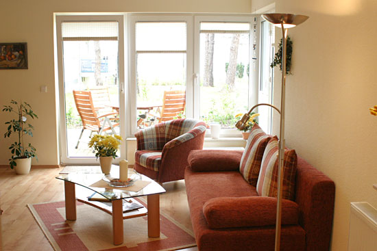 Modern und trotzdem gemütlich eingerichteter Wohnbereich mit Terrassenzugang und Blick auf die See.