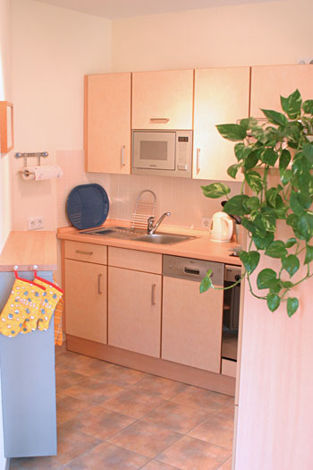 Blick in die Küchenzeile. Die Küche ist komplett ausgestattet.