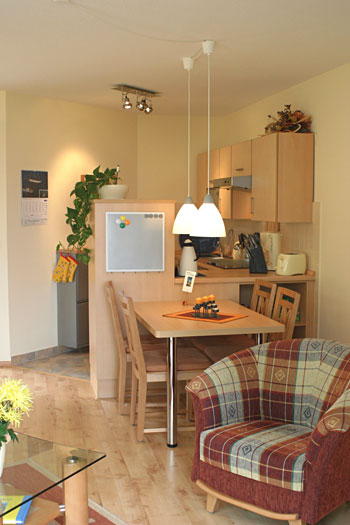 Esstisch und die Küchenzeile dahinter.